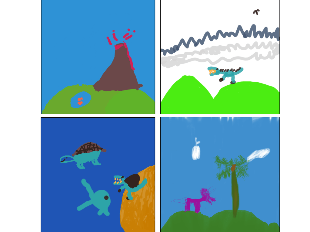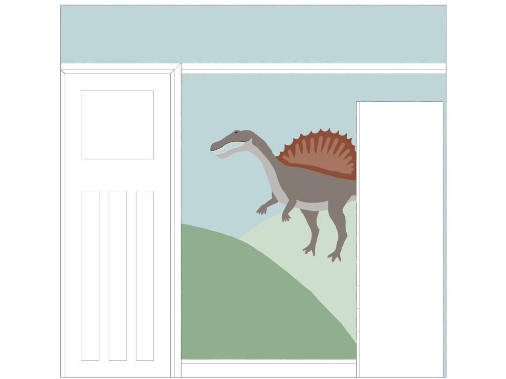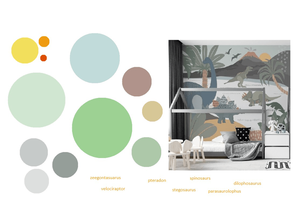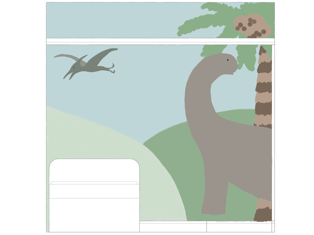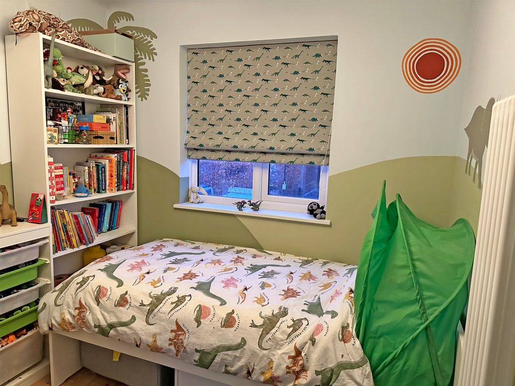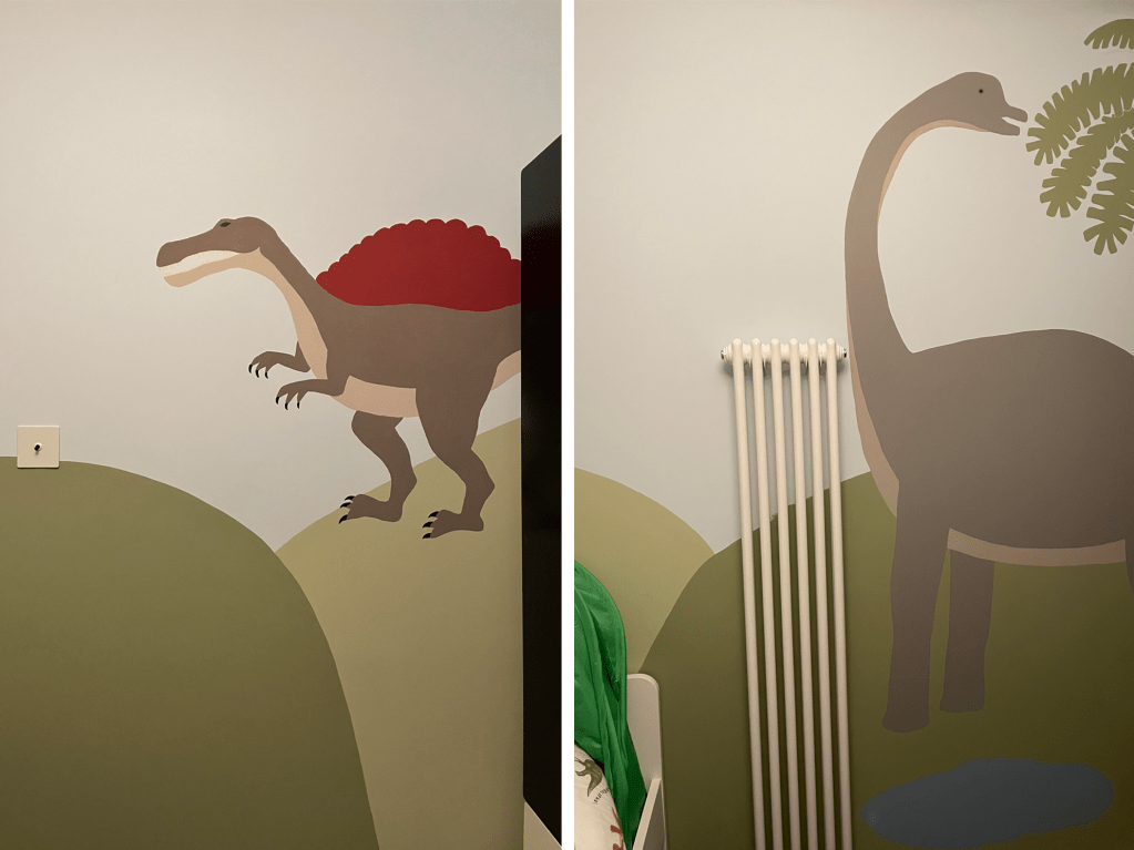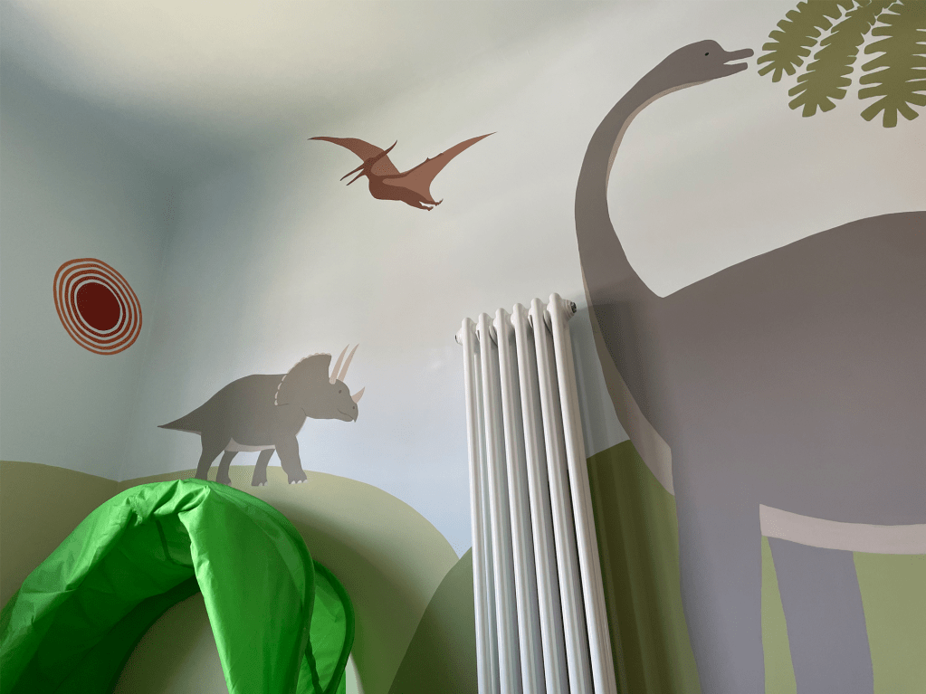 The smallest room in the house but the biggest opportunity to make a six year old dinosaur expert’s dream bedroom! We took inspiration from some wonderful drawings of dinosaur scenes the little boy had drawn on our IPad and used them to create a unique dino land for him to sleep and play in.